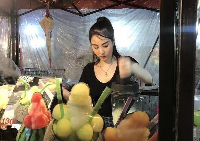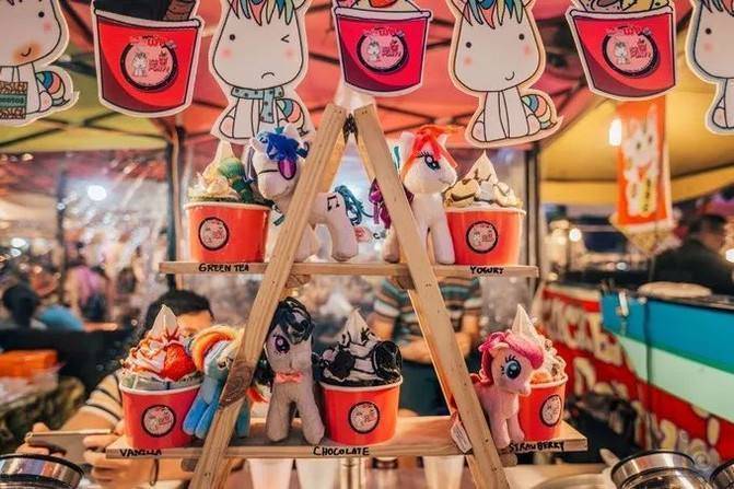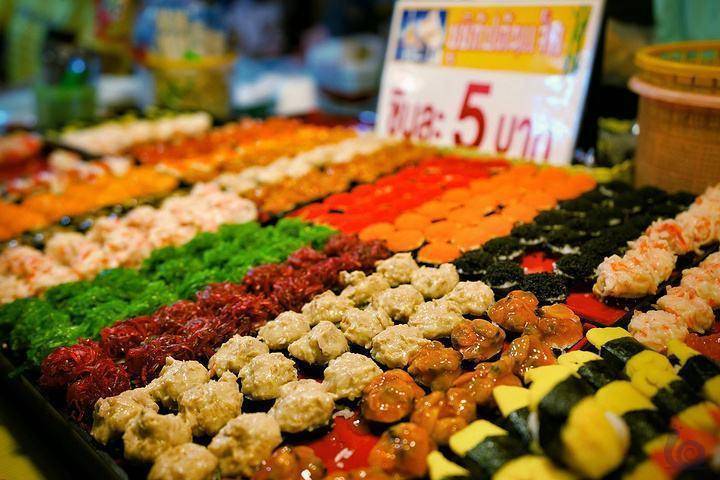 曼谷出名的火车头夜市,十元可以吃曼谷特色小吃到撑,琳琅满目的小玩意随你挑,出名的水果西施就在这里。