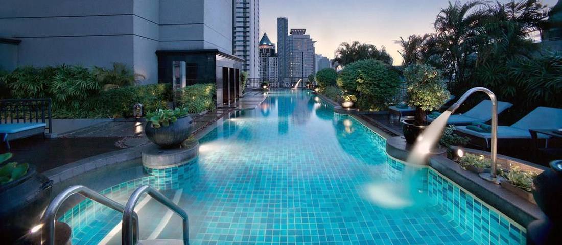 曼谷泳池周围环绕着绿植,以曼谷天际线为背景,营造热带泳池的体验。