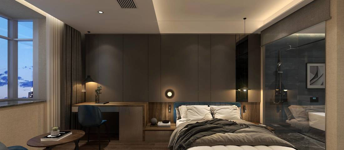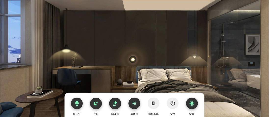 房间内配备了智能硬件,如电动窗帘、智能多媒体、智能灯控等,通过房间内的平板即可控制。