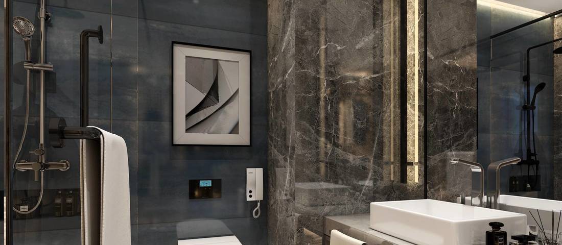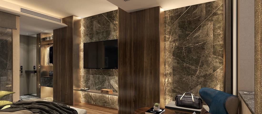 智能酒店在主色调上,设计师采用了高级灰为主调,配达有气派但又不俗气的云石以呈现现代时尚的风格。