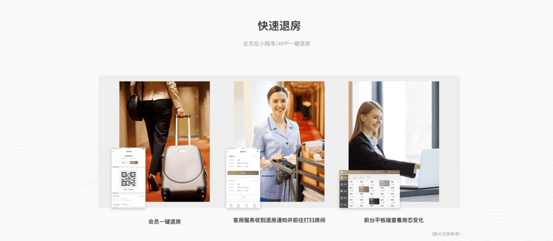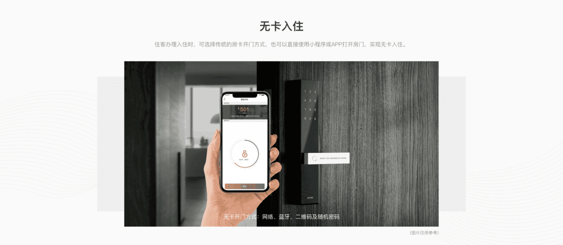 在设计方面与智能结合,能让客户的入住舒适度更好,用户通过小程序预定后,可以直接前往酒店的自助入住机办理入住,节省住客时间;办理入住后可以通过微信小程序打开房间门,不需要再另外使用门卡。
