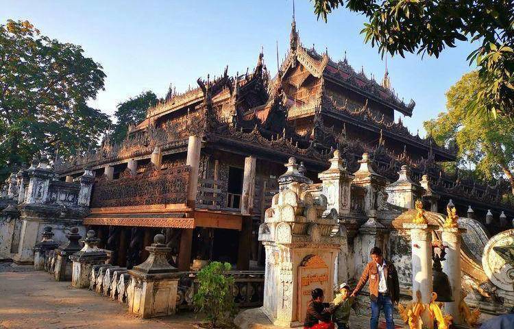 门窗有图案雕花木饰.建筑使用了缅甸柚木和古塔一样的红砖。