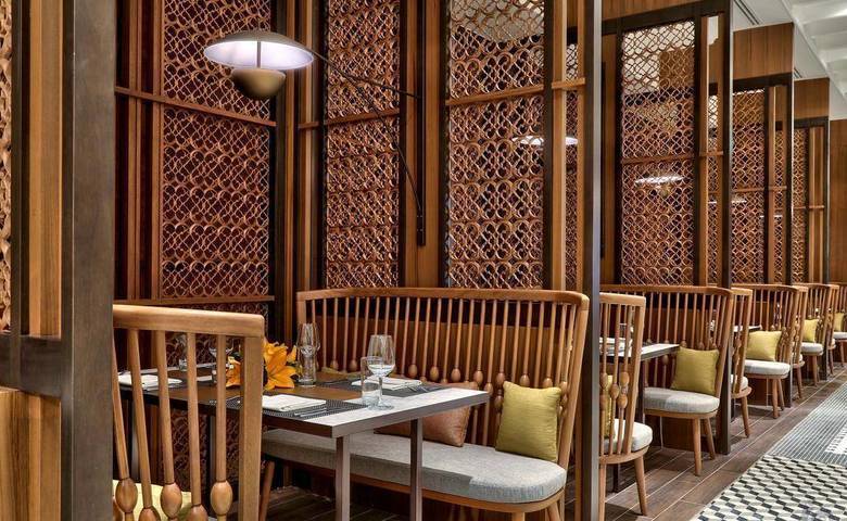 酒店共六层,宛若私家园林设计的布局,红屋顶与黄木桩融合了东南亚的风格。