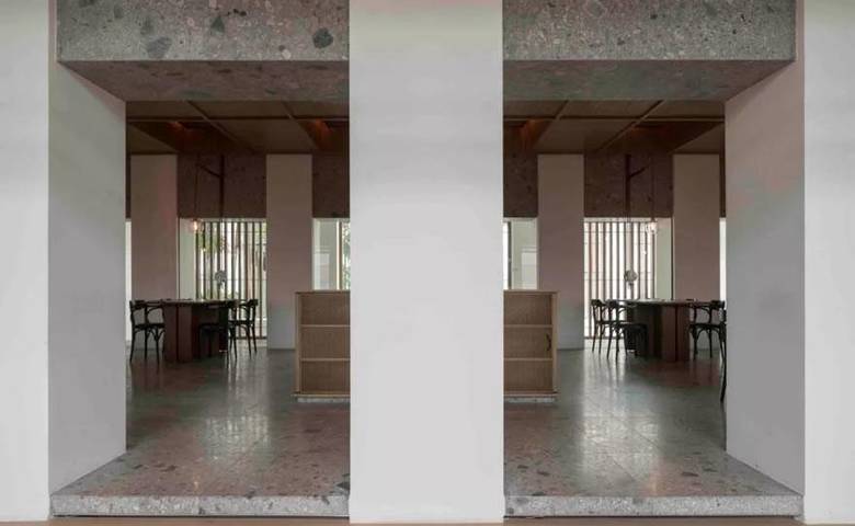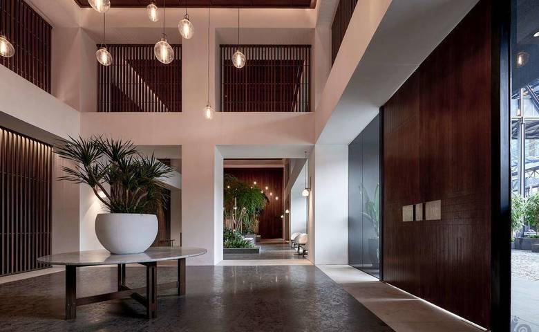 酒店的公共空间围绕室外庭院依次布局,跨越三层楼高,由规则的柱梁组成。