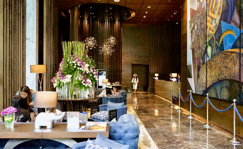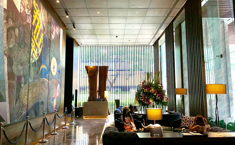 步入大堂,深褐黑胡桃木的主基调充溢全空间,墙上出自本土当代知名艺术家Panya Vijinthanasarn之手的巨幅“好运之路”主题浓郁泰风壁画悄然夺目。