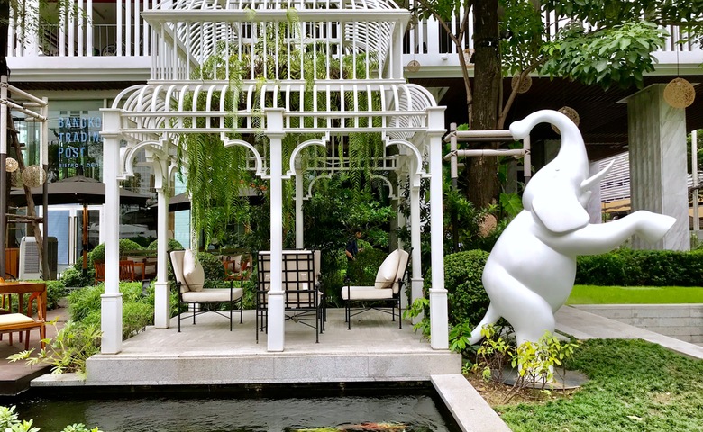 户外小庭院清新自然,鸟笼状小凉亭、佛国代表的象雕和露天用餐桌椅组成的白绿清爽配色精致园林,无疑乃INS风取景好去处。