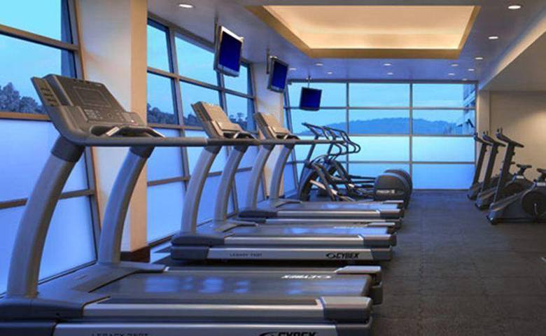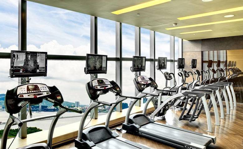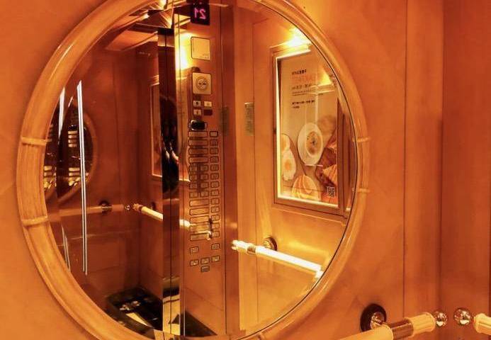 酒店的健身房很宽敞,设备也很多,泳池也是在这一层,酒店的电梯是具有年代感的百乐门设计风格,给人的感觉十分的沉稳大气。