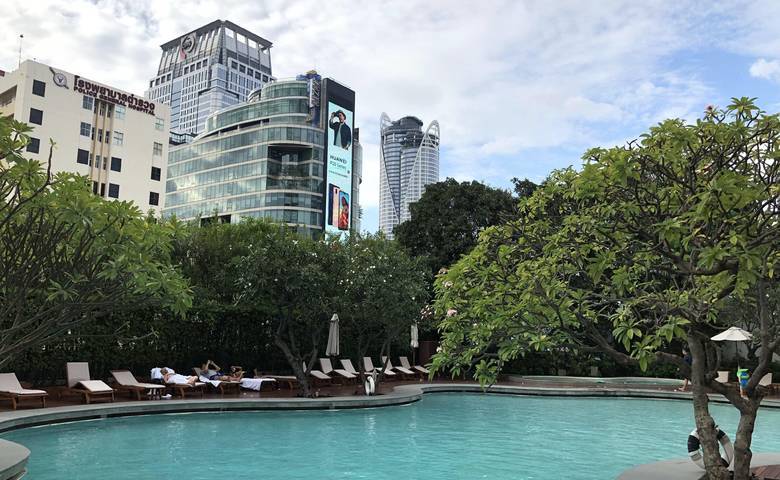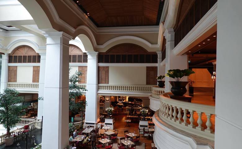 曼谷君悦爱侣湾酒店位于BTS Chidlom 出口处,交通极其方便,市中心的标志性酒店。浓郁的南洋建筑风情。外廊阳台,交叉大楼梯,室内园林,惬意。舒服自然。