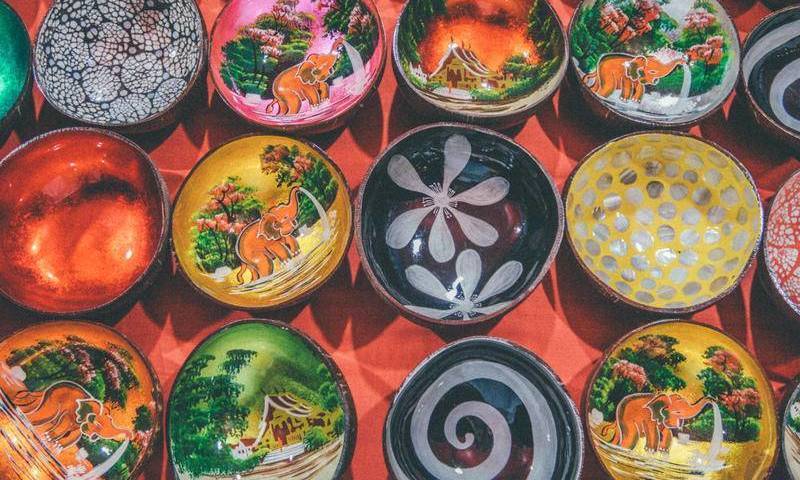 一个个摊档摆满了色彩丰富的手工制品、木雕以及手工画,琳琅满目美不胜收。
