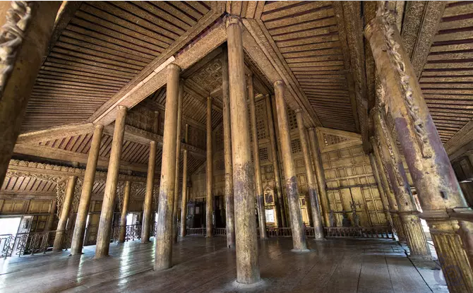 现在仅能在外部高处的犄角旮旯处和内部看到残留的金色。为了保护这些珍贵的木雕,现在外部木雕用黑漆涂刷。虽然不再金光闪闪,却永远笼罩着神奇之光。