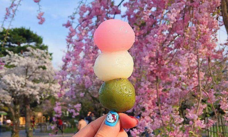 花见团子是日本文化的重要组成部分。这款三色花见团子只有在樱花季节才能吃到,粉色代表天空,绿色代表草地,而白色是冬季还未消融的雪花。