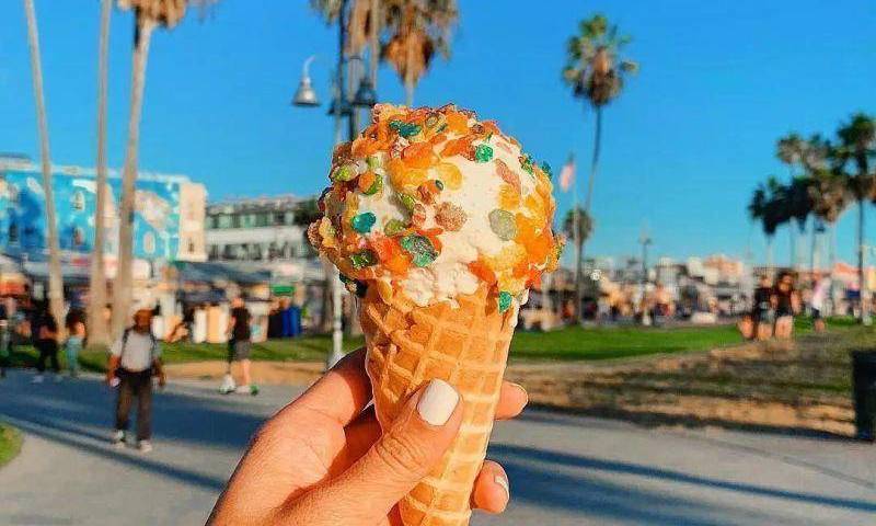洛杉矶威尼斯海滩,晚霞暖暖地照在棕榈树和地面每个角落。来一个牛奶麦片冰淇淋,上面撒着小果干。一口下去,却开始怀念童年。