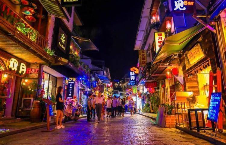 来西街,久负盛名当属阳朔第一名菜的啤酒鱼不可不尝,这里还有很多酒吧,夜幕降临,比白昼更加热闹。