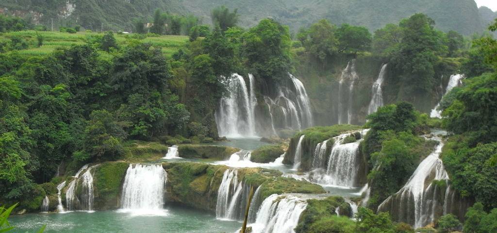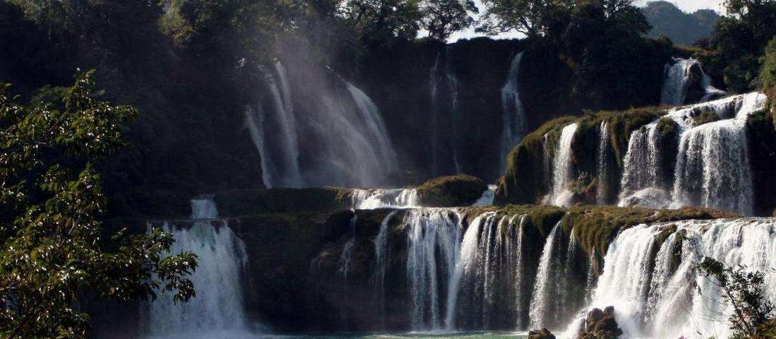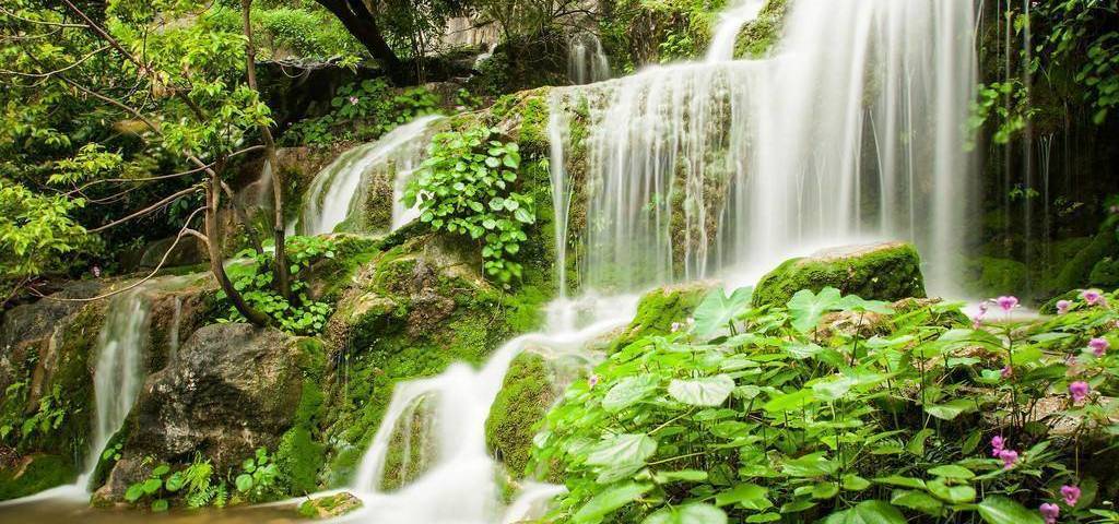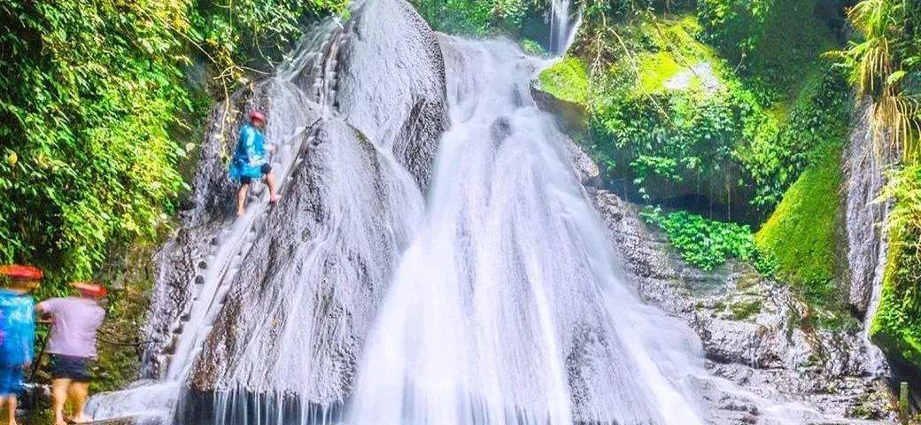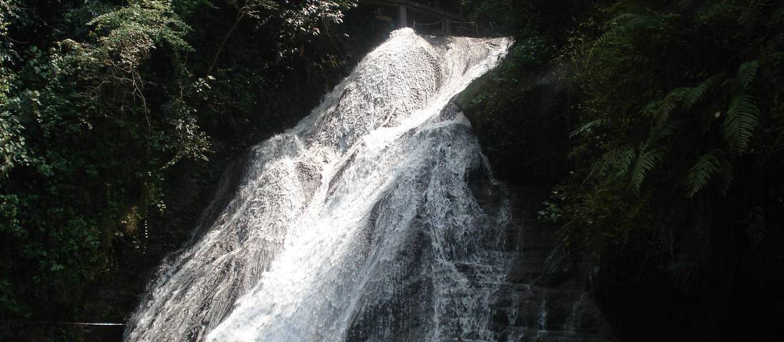 瀑布共9级,全程落差90米。清澈的水幕从高山顶端滑泻。水缓处,水流轻抚脚背,如趟溪流;水急处,没至大腿,惊险又刺激,就算变成一只“落汤鸡”也让人兴奋。