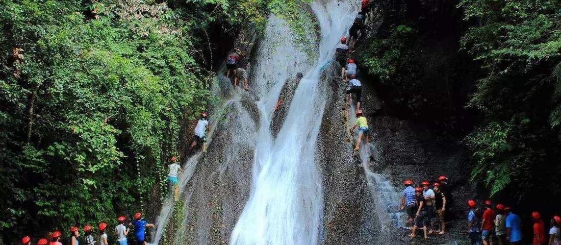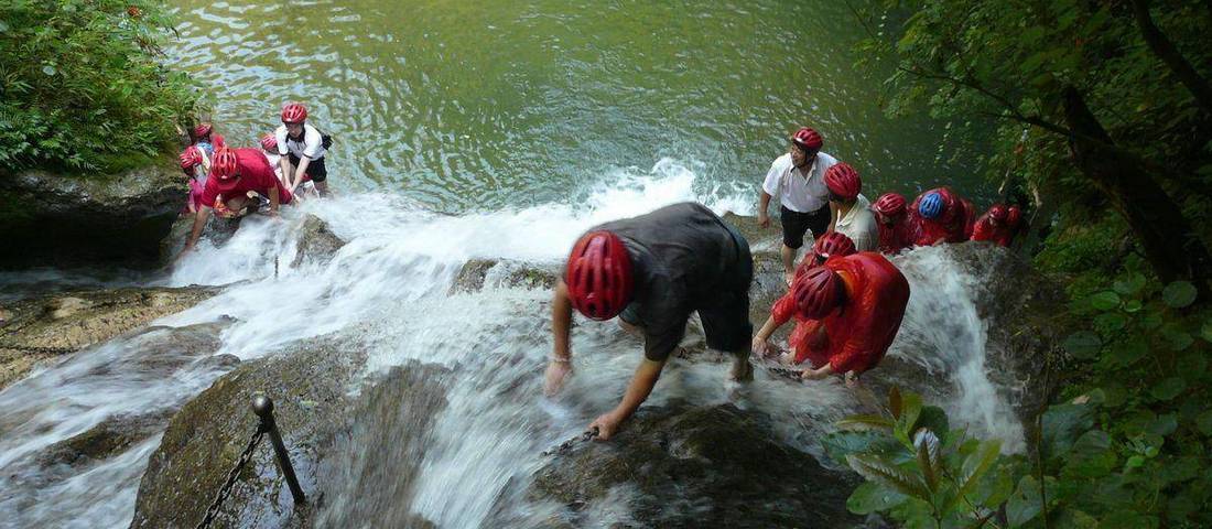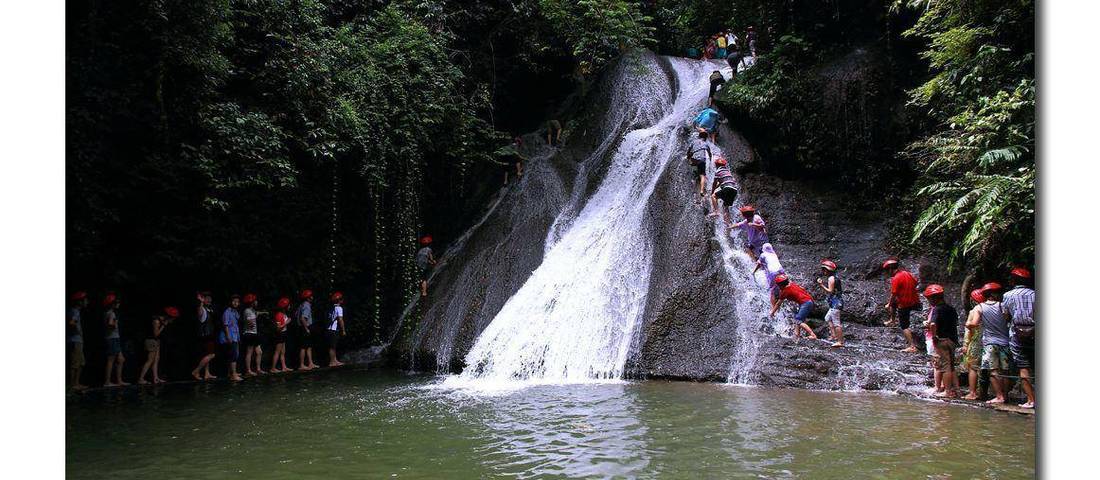 古东瀑布最大的特色是你可以穿着雨衣、草鞋,一路踏着陡峭的石壁逆流而上。