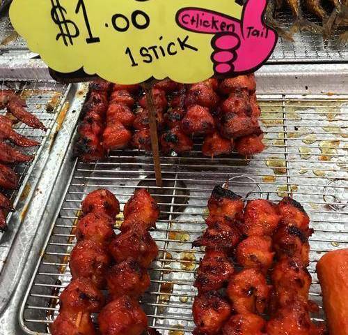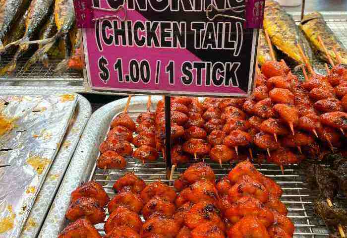 文莱人认为鸡屁股是最营养的地方,将鸡屁股通过腌制后,涮上酱油和蜜糖,在烧烤架大火烧烤,香飘十里,让人垂涎欲滴。