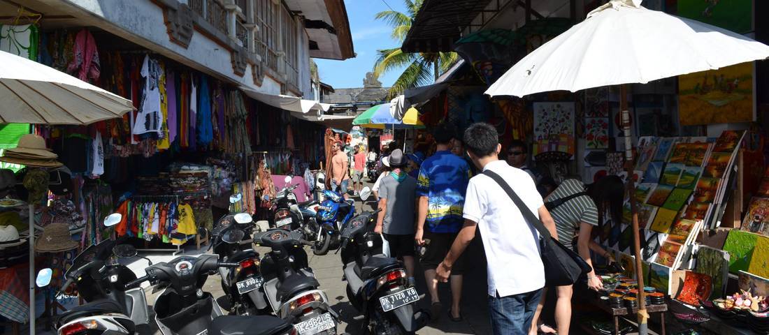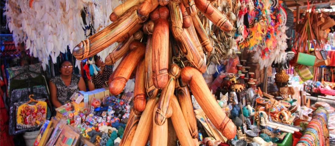 乌布市场街边两旁摆卖琳琅满目的商品,摆卖的都是当地比较出名的特色饰品和木制品,由于当地人生殖崇拜文化,也有售卖许多独特的样件。