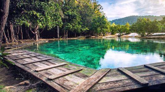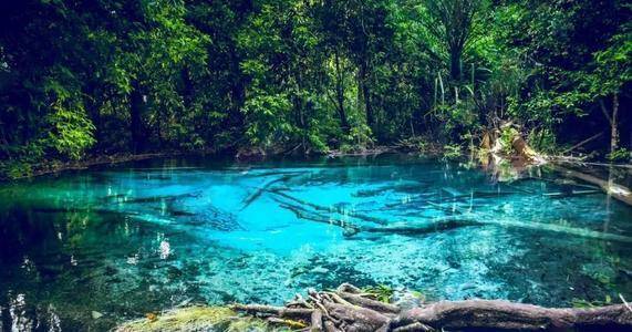 甲米翡翠湖被中国旅行者誉为”泰国的九寨沟“,因为这里的湖水呈漂亮的翡翠色,清澈见底,可以清晰看到水底纵横交错的枯木,湖心不断翻滚涌出浑浊浪花。